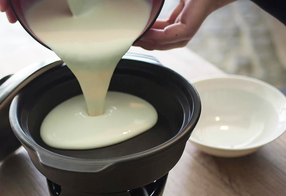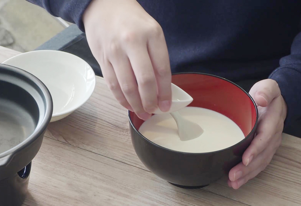 まず、高濃度の豆乳を使用し、豆腐作りを1から体験していただきます。シンプルな手作り工程を通して、豆腐の魅力や日本の食文化の伝統に触れることができます。